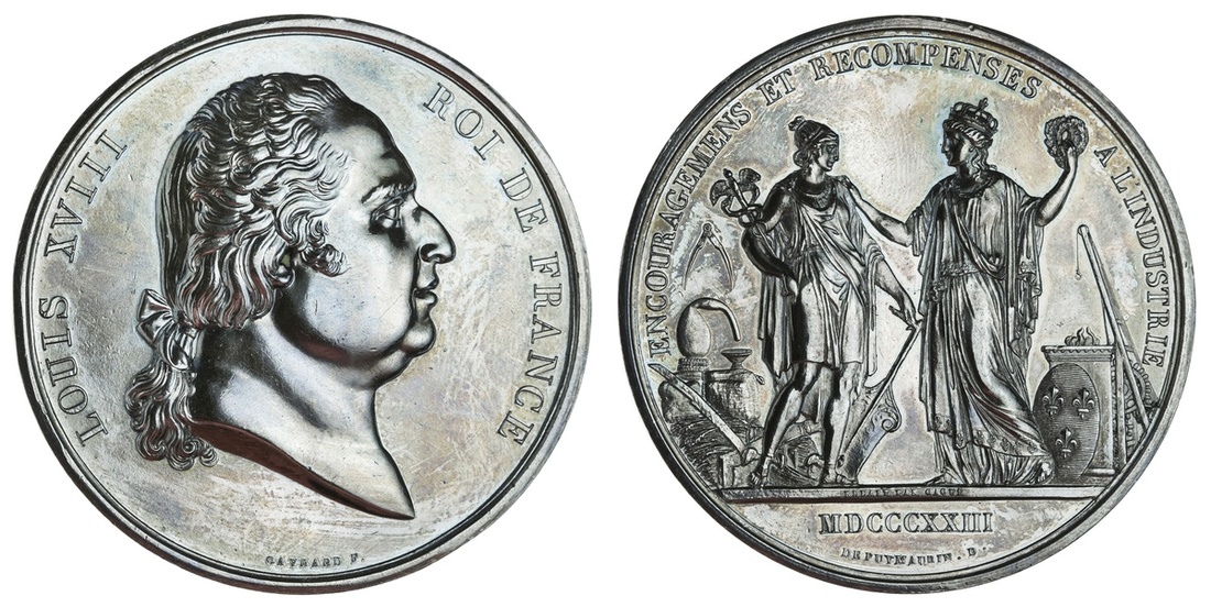France. Louis XVIII (1814-1824). Encouragemens et Recompenses a l'Industrie, 1823. Medal. Silver, 56.2mm. 95 gms. By Gayrard. Bare head right, rev France presenting wreath to Industry at left, who holds a caduceus, various implements behind her. Plain edge. A few tiny rim tics. Pale hematite-silver over some minor hairlines. Uncirculated.