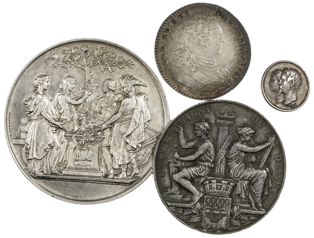 France. Trio of medals. Napoleon III. Société des Sciences Industielles Arts et Belles Lettres de Paris. Award Medal, 1862. Silvered Copper, 51mm. By Depaulis. France, Asia, Africa, and North America stand around a tree and altar. Awarded to Bagriot - Fabrication de Boutons. Edge: (bee) CUIVRE. Hairlines in fields. Uncirculated; Enseignement du Dessin. Silver, 41mm, 38.1 gms. By Chaplain. Laureate head left/ Young woman and man seated back-to-back by column, Paris Arms below. Edge: (bee) ARGENT. EF; Prince Imperial - Louis-Napoleon, 1856. Silver, 16mm. By Caque. Conjoined heads of parents Napoleon III and Eugénie left / Infant head left. VF; and Silver Jeton. Louis XV. Secretaires de Roi, 1731. Bust right / Swarm of bees and sunface. VF. (4)