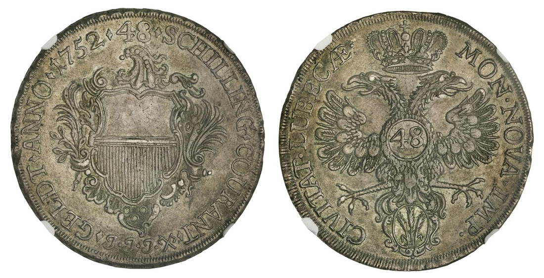 German States. Lübeck. Freie Hansestadt. Taler of 48 Schilling, 1752 JJJ. City Arms in a baroque cartouche, rev. Imperial eagle, numeral value on breast. Dav.2420, KM 168. One-year type. NGC AU 55. Pale blue-gray tone.
