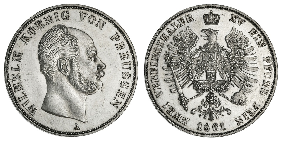 German States. Prussia. Wilhelm I (1861-1888). Double Taler, 1861 A. Berlin. Bare head right, rev. Crowned Imperial eagle, Arms on breast and wings. KM 491. A few old contact marks. Good lustre. Uncirculated.