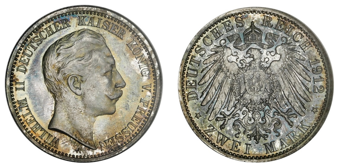 German States. Prussia. Wilhelm II (1888-1918). Proof 2 Mark, 1912 A. Berlin . Head right, rev. Imperial eagle. KM 522. Light hematite-gray with pleasing iridescent hues. NGC PF 67.