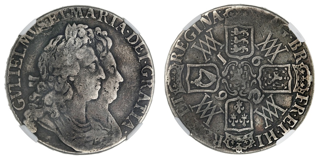 England. William and Mary (1689-1694). Crown, 1692/inv. 2. QVINTO. Draped, conjoined busts right, rev. Crowned cruciform Arms, date inner angles, WM monogram outer. S.3433, KM 477. NGC VG 10. Really closer to Fine.