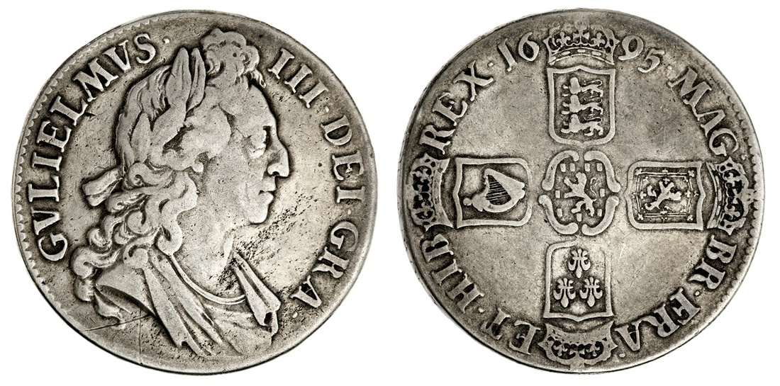 England. William III (1694-1702). Crown, 1695. First laureate, draped bust right, rev. Crowned cruciform Arms, Nassau lion at center. S.3470, KM 486. Some light haymarking, scratch below bust. About Fine.