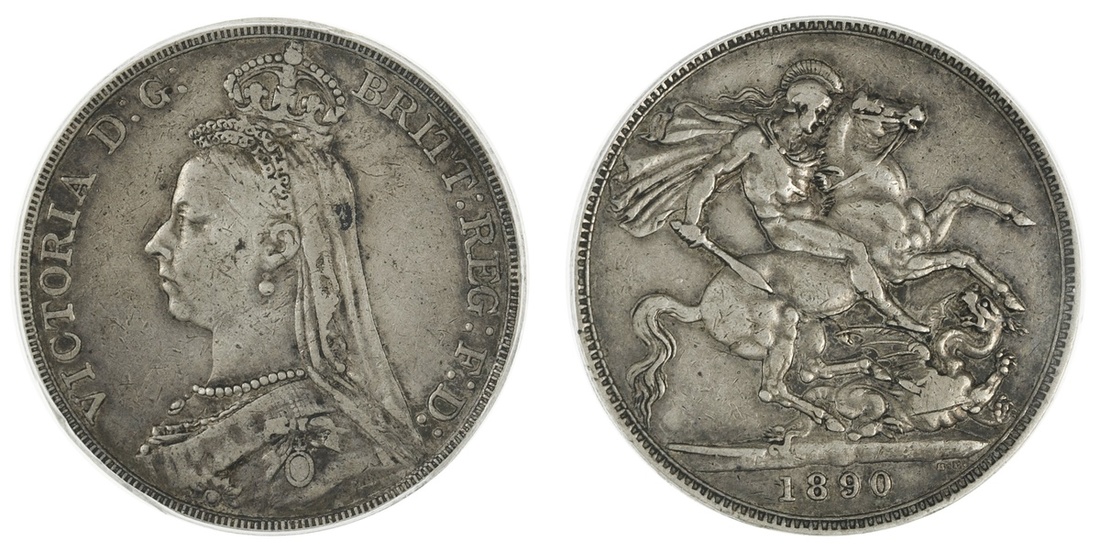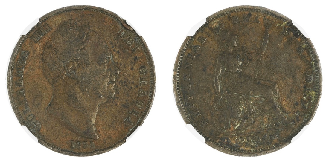 B>Great Britain. William IV-Victoria. Pair of encapsulated coins. Penny, 1831. NGC XF details, rim damage; Crown, 1890. PCGS VF 35. (2)