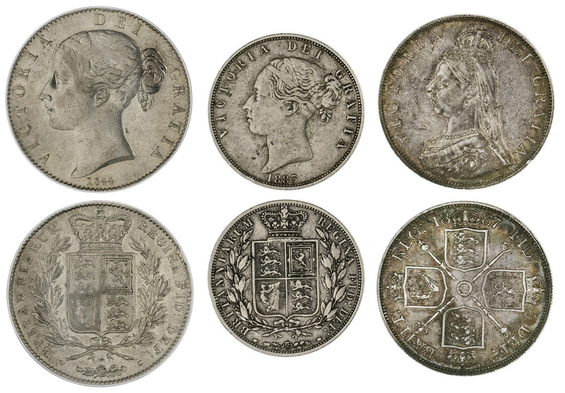 Great Britain. Victoria (1837-1901). Trio of silver issues. Crown, 1844. PCGS Genuine, surface damage; small obverse dig, contact marks About VF-VF details; Double Florin, 1887, Roman "1". Toned over some contact marks, EF; and Halfcrown, 1883. Fine+. (3)