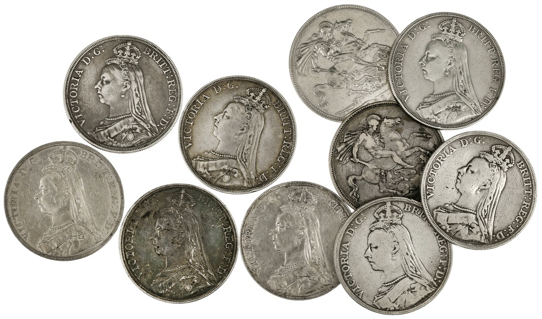 Great Britain, Victoria (1837-1901). Lot of Jubilee Bust Crowns: 1887, 1889 (4), 1890, 1891 (3), and 1892. S.3921, KM 765. A few once cleaned or with surface issue. About Fine-About EF. (10)