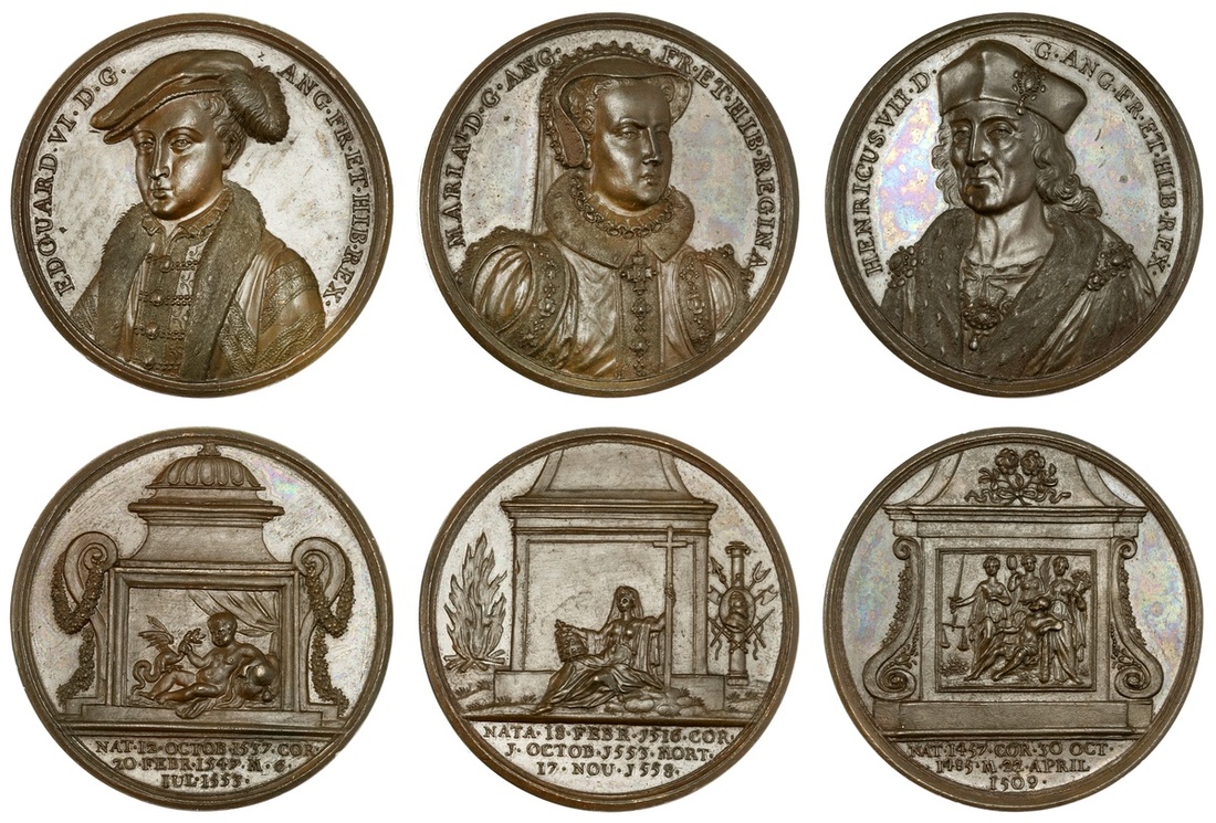 England. House of Tudor. Henry VII 1509, Edward VI 1553, and Mary 1558. Memorial Medals. Bronze, 41mm. By Jean Dassier; from his 1731 English Kings and Queens series. Eimer 25, 30, 38. Choice Uncirculated. (3)