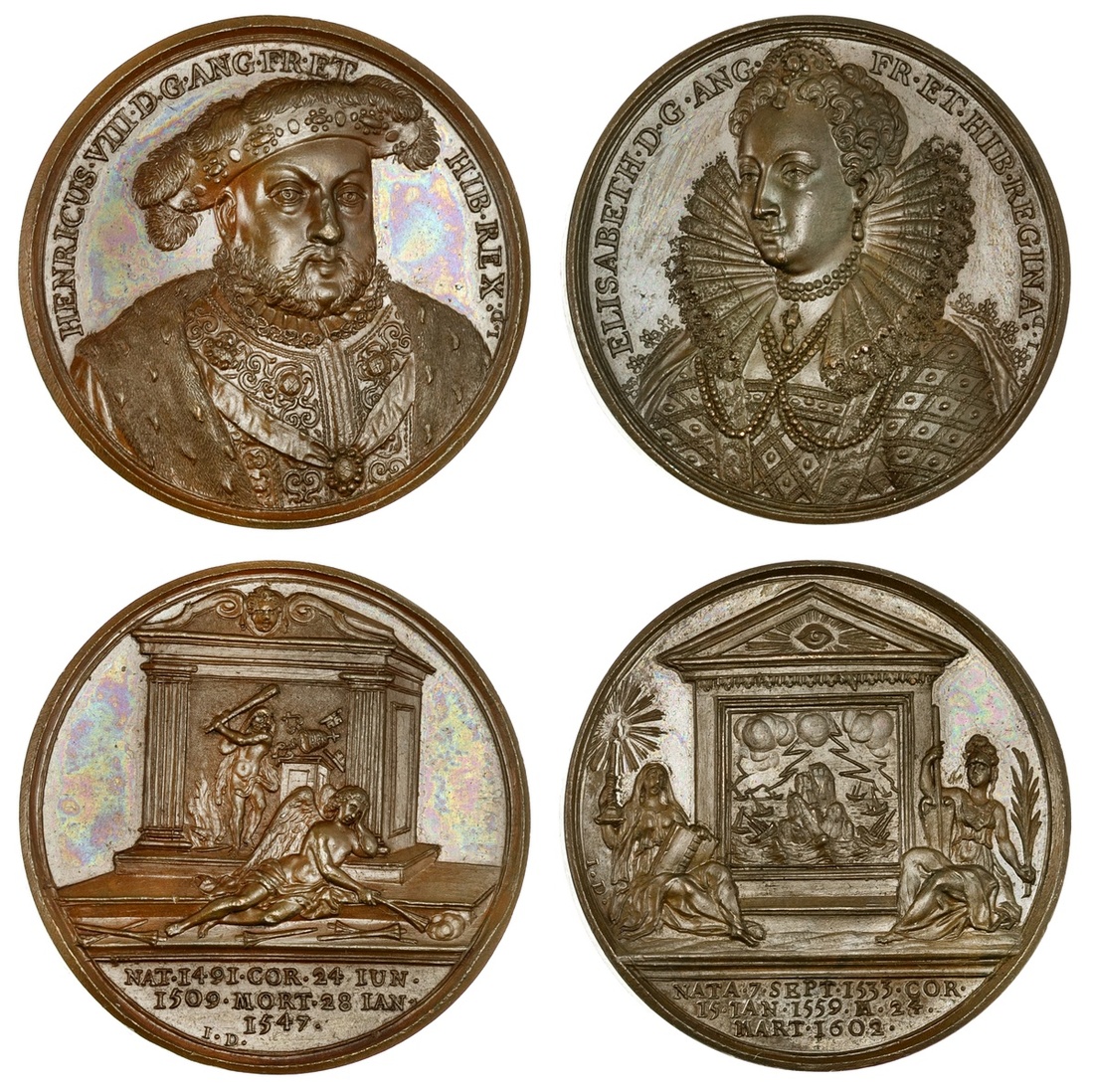 England. House of Tudor. Henry VIII 1547 and Elizabeth I 1602. Memorial Medals. Bronze, 41mm. By Jean Dassier; from his 1731 English Kings and Queens series. Eimer 27, 79. Choice Uncirculated. (2)