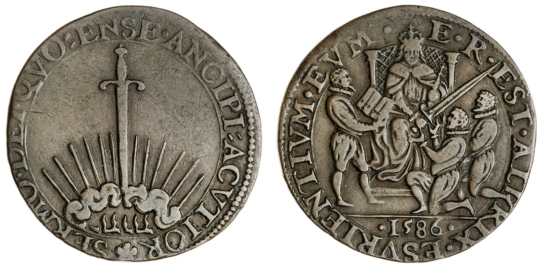 England. Elizabeth I (1558-1603). Assistance Given to the United Provinces, 1586. Dutch Jeton. Copper, 28.7mm. The queen enthroned facing, a courtier beside her, presents a sword to two kneeling figures; E.R. EST. ALTRIX. ESVRIENTIVM.EVM., rev.Upright sword, its tip piercing radiate celestial clouds around Hebrew letters; *SERMO. DEL. QVO= ENSE. ANCIPI=ACVTIOR. Eimer 52; MI i 133/87; v. Loon I, 359. Very Fine.