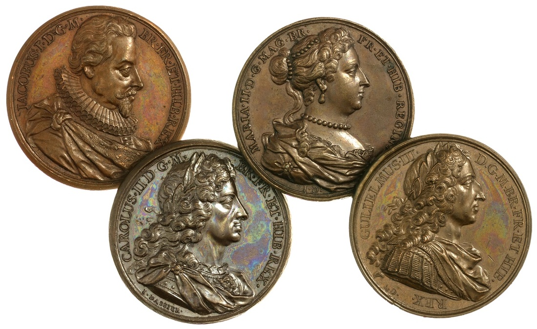 England House of Stuart. James I 1625, Charles II 1685, Mary 1694, and William III 1702. Bronze, 41mm. By Jean Dassier; from his 1731 English Kings and Queens series. Eimer 104, 271, 364, 387. Choice Uncirculated. (4)