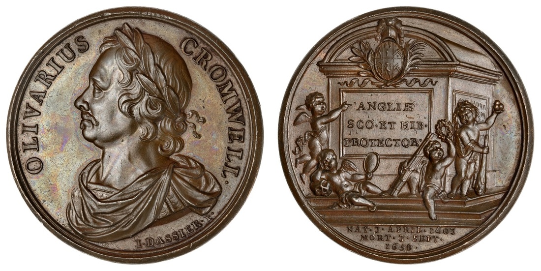 England. Commonwealth. Oliver Cromwell Memorial Medal, 1658. Bronze, 38.5mm. By Jean Dassier; from his 1731 English Kings and Queens series. Laureate, armored and draped bust left, rev. Monument inscribed: ANGLIAE SCO. ET HIB. PROTECTOR, shield, helmet, and palm resting upon it, four infant genii below. Eimer 203; MI i 435/87. Choice Uncirculated.