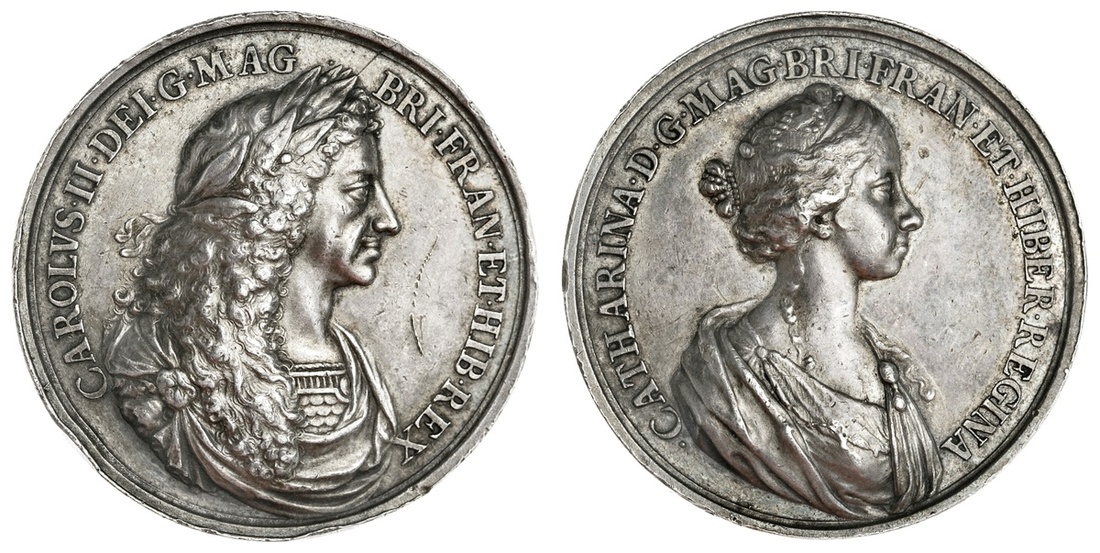 England. Charles II (1660-1685). On the Marriage of Charles II to Catherine of Braganza, 1662. Medal. Silver, 43mm. By J. Roettier. Laureate, draped and cuirassed bust of Charles right, rev. Draped bust of Catherine right, her hair adorned with pearls. Eimer 224; MI i 489/111; v. Loon II, 471. A few small edge bruises and old abrasion before bust. Toned. About Extremely Fine.