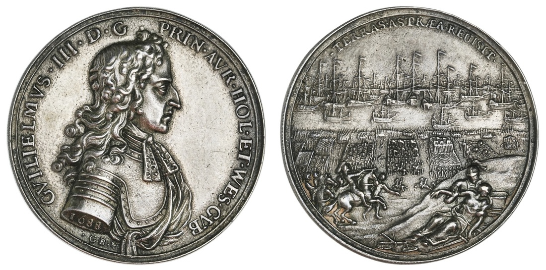 England. James II (1685-1688). Landing of William of Orange at Torbay, 1688. Cast Medal. Silver, 48mm. By G. Bower. Armored and draped William bust right, rev. Equestrian figure of William right leading his army assembled on a beach, the Anglo-Dutch fleet at anchor in the background. Eimer 297Bb; MI i 639/64; v. Loon III, 353. Steely pearl-gray. Extremely Fine.