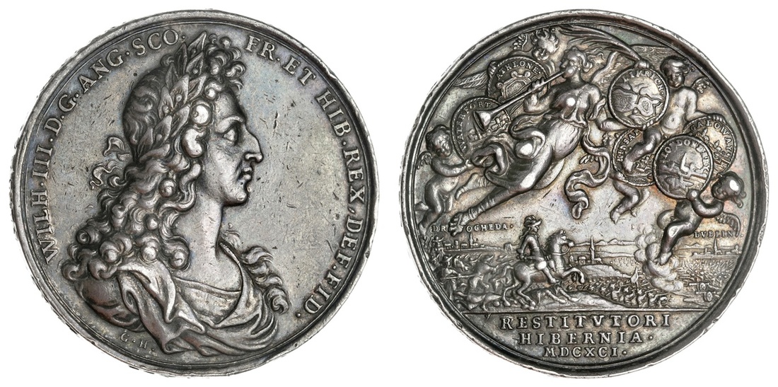 England. William and Mary (1688-1694). Pacification of Ireland, 1691. Medal. Silver, 40.7mm. By Georg Hautsch. Laureate, draped William bust right, rev. Victory, sounding clarion, flying right attended by infant genii displaying six medallions each with a city plan: WATERFORT, ATHLONE, LIMRICH, KINSAL., LONDONDERY, GALOWAY, equestrian figure of William right below leads his troops to battle before DROGHEDA and DVBLIN. Eimer 341; MI ii 41/224; v. Loon IV, 61. Some tiny rim tics. Soft russet highlights. Extremely Fine.