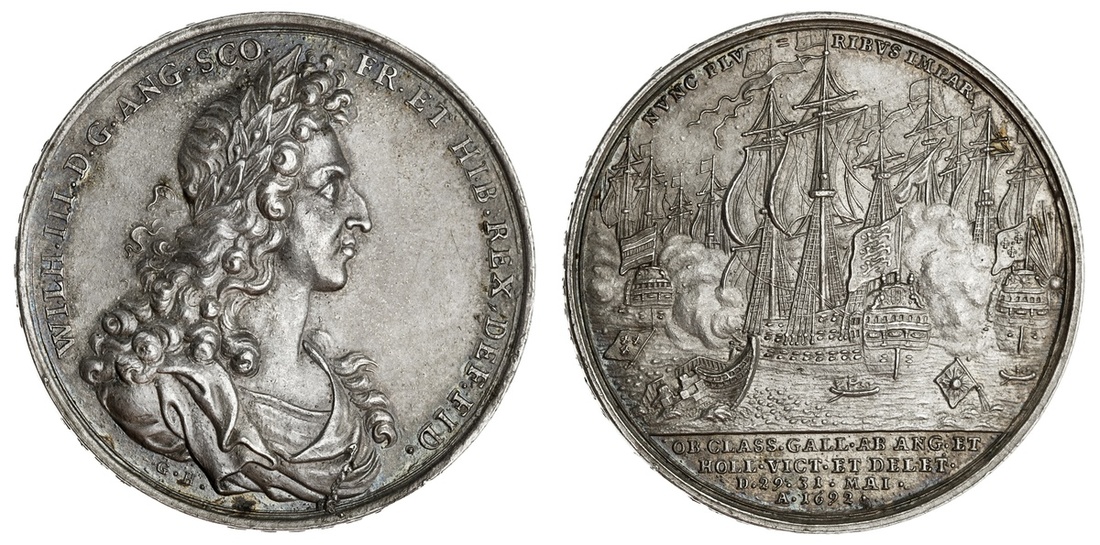 England. William and Mary (1688-1694). Battle of La Hogue. Medal. Silver, 40.6mm. By Georg Hautsch. Laureate and draped William bust right, rev. Naval engagement - flagships of Admiral Allemonde, Admiral of the Fleet Edward Russell's Britannia at the center, and the French flagship le Soleil Roi of admiral de Tourville sinking at the left, its colors still visible; NVNC PLV=RIBVS IMPAR. Eimer 348; MI ii 59/258; v. Loon IV, 104. Light lavender-gray with peripheral iridescent hues. Extremely Fine.