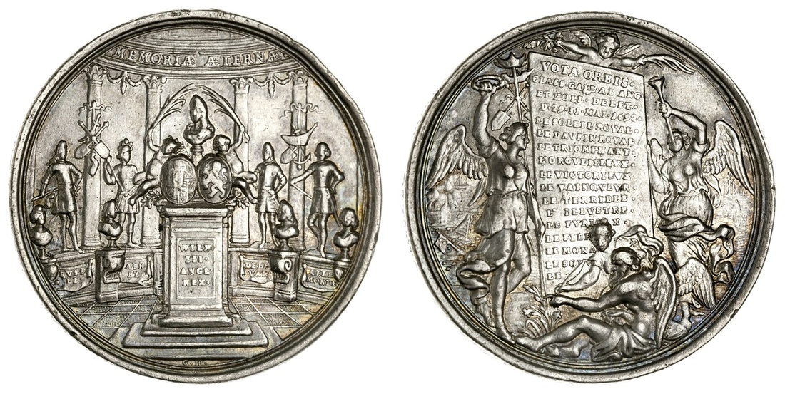 England. William and Mary (1688-1694). Battle of La Hogue, 1692. Medal. Silver, 45mm. By Georg Hautsch. William III bust on a pedestal flanked by putti holding palm fronds and the shields of England and Holland, portico behind with statues of the fleet commanders Russel, Ashby, Delaval and Almonde and busts of the vanquished, rev. Time sits at the bottom of a tall tablet, flanked by Victory and Fame, inscribing the story of the battle, naval engagement in the background. Erlander II, 2533; v. Loon IV, 36, 4. Very rare. Tiny rim tic. Very Fine.