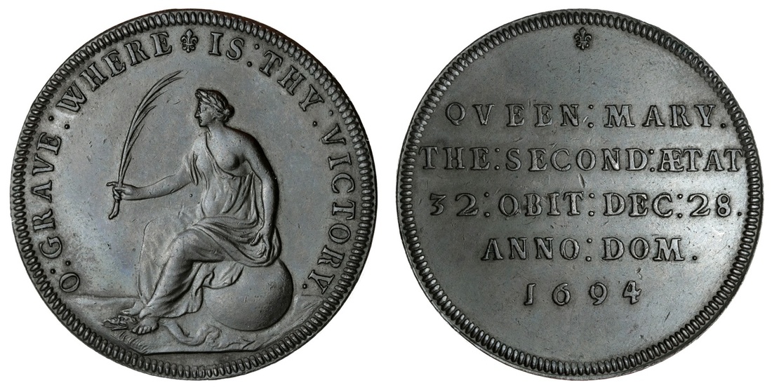 England. William and Mary (1688-1694). On the Death of Mary, 1694. Medal. Bronze, 40mm. By J. and N. Roettier. Mary seated left upon a globe holding a palm frond, rev. Four-line legend and date. Eimer 363; MI ii 121/364. Very scarce. Deep olive-brown. About Extremely Fine.