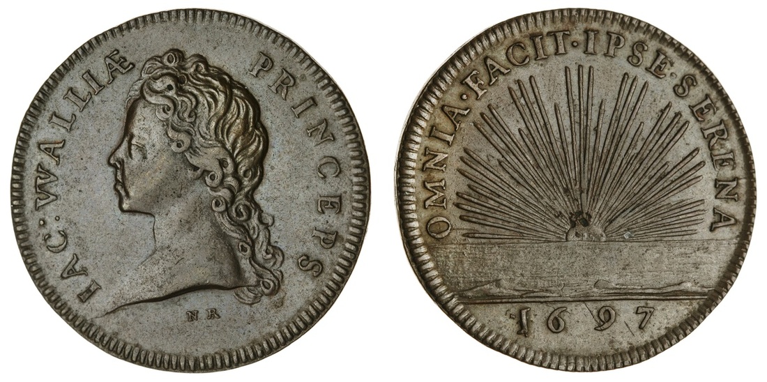 England. William III (1694-1702). Treaty of Ryswick - Fortunes of Prince James Francis Edward Stuart, 1697. Medal. Bronze, 25mm. By N. Roettier. Young bust left of the old pretender; IAC: WALLIAE PRINCEPS, rev. Radiant sun rising above a calm sea; OMNIA. FACIT. IPSE. SERENA ("He makes all things serene"). Eimer 376; MI ii 194/503; v. Loon IV, 247. Good Very Fine.
