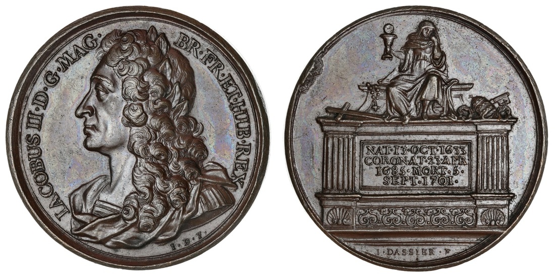 England. William III (1694-1702). James II Memorial Medal, 1701. Bronze, 41mm. By Jean Dassier; from his 1731 English Kings and Queens series. Laureate, armored and draped bust left, rev. Religion seated mourning atop a tomb. Eimer 384; MI ii 215/537. Characteristic reverse die cud a trim. Choice Uncirculated.
