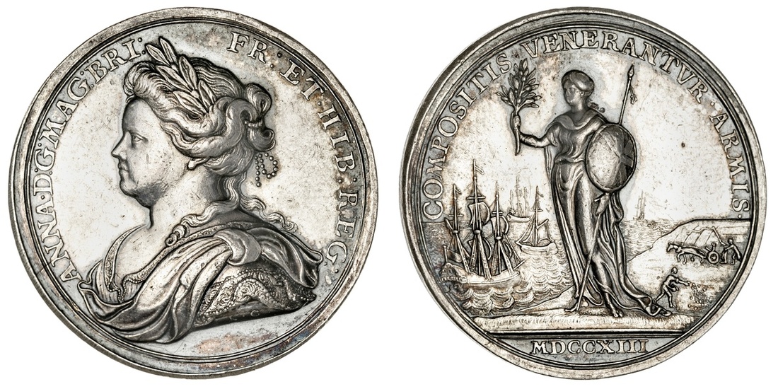 England/Great Britain. Anne (1702-1714). Post-Union. Peace of Utrecht, 1713. Medal. Silver, 35mm. By J. Croker. Laureate and draped bust left, rev. Britannia standing left holding olive branch, shield and spear; ships and a farming scene behind her. Eimer 460; MI ii 400/257; v. Loon V, 230, 6. Toned. About Extremely Fine.