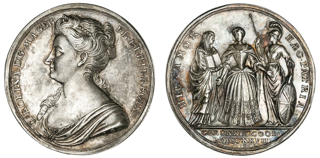 Great Britain. George II (1727-1760). Coronation of Caroline, 1727. Official Medal. Silver, 34.7mm. By J. Croker. Draped bust left wearing bandeau, rev. The Queen standing facing between Religion and Britannia; HIC. AMOR HAEC. PATRIA. Eimer 512; MI ii 480/8. Nick on brow. Slight obverse die shift. Attractive iridescent hues. Uncirculated.