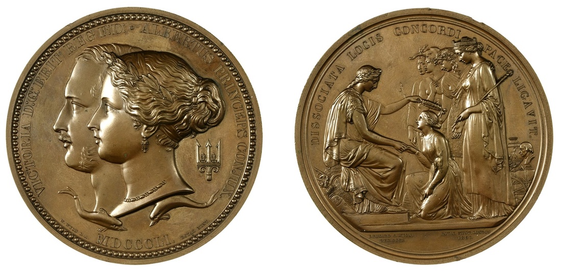 Great Britain. Victoria (1837-1901). Great Exhibition 1851, Prize Medal. Bronze, 77mm. By W. Wyon. Conjoined busts of Victoria and Albert left, trident behind, dolphin before, rev. Britannia seated right placing a wreath upon the head of a kneeling Industry, Africa, America, Asia and Europe standing behind in attendance. Awarded to: "J. WANSBOROUGH. CLASS XXVIII." on edge. BHM 2462, Eimer 1456. Shallow scrape across edge removing the first "O" in the recipient's name. Otherwise Uncirculated and lovely.