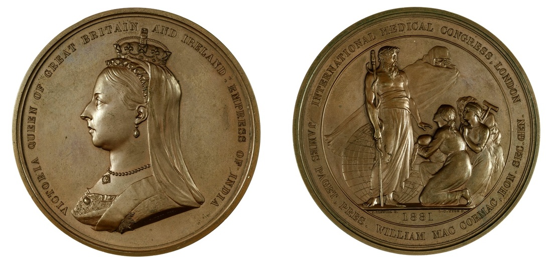 Great Britain. Victoria (1837-1901). International Medical Congress, London 1881. Medal. Bronze, 77mm. By L.C. Wyon. Crowned, draped and veiled bust left, rev. Hippocrates protecting the world's people from the looming figure of death, globe behind. BHM 3110, Eimer 1683, Storer 6307. Rich dark chestnut brown with a pale blue undertone. Uncirculated.