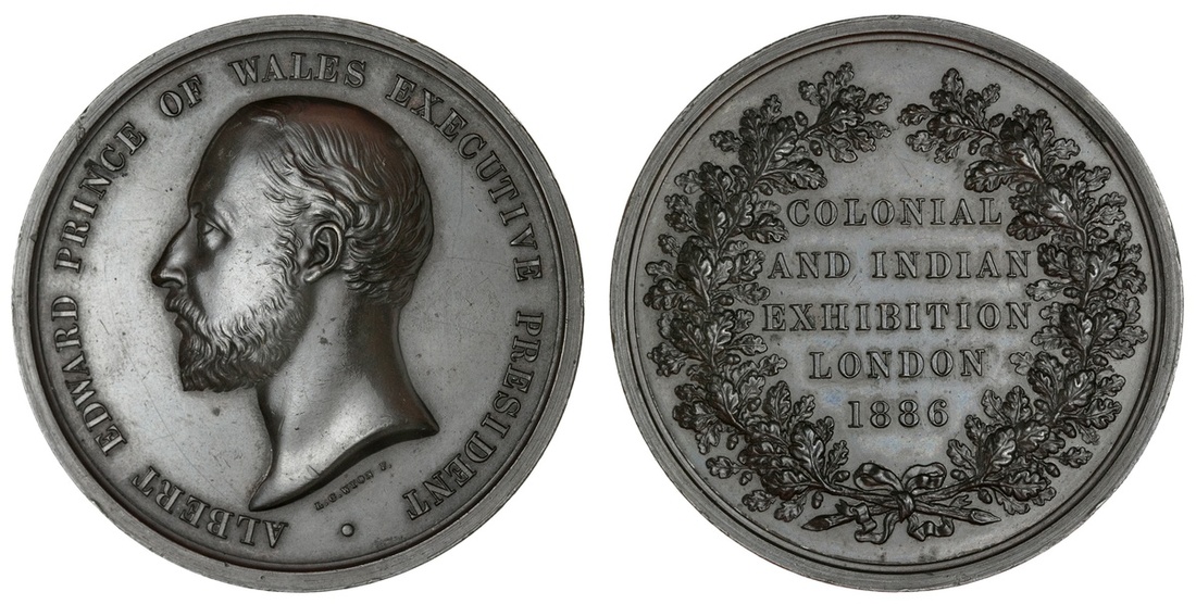 Great Britain. Victoria (1837-1901). Colonial and Indian Exhibition, London 1886. Prize Medal. Bronze, 52mm. By L.C. Wyon. Albert. Prince of Wales bust left. rev. Exhibition legend within wreath. BHM 3209, Eimer 1725, Pudd.886.1.2. Deep olive-brown over a few obverse hairlines. Good Extremely Fine.