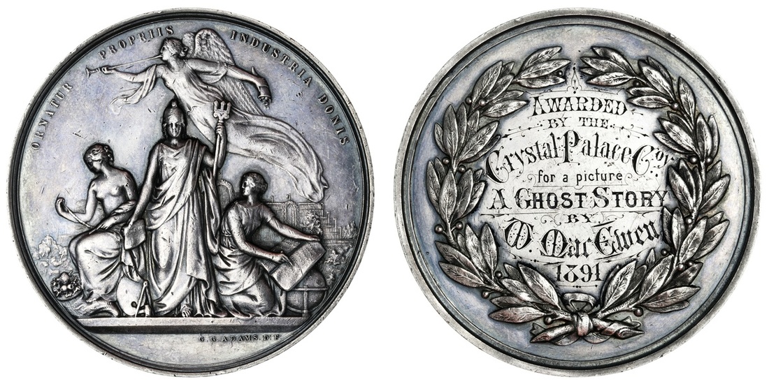 Great Britain. Victoria (1837-1901). Crystal Palace Picture Gallery Prize Medal, 1891. Silver, 63.5mm. 108.9 gms. By G.G. Adams. Britannia standing facing, flanked by Plenty and Learning, Fame flying left above, rev. Wreath, engraved: "AWARDED BY THE Crystal Palace Coy. for a picture A GHOST STORY BY W. MacEwen 1891". Allen SY-1873/001 var., BHM --. A few small rim tics. Toned. Very Fine.