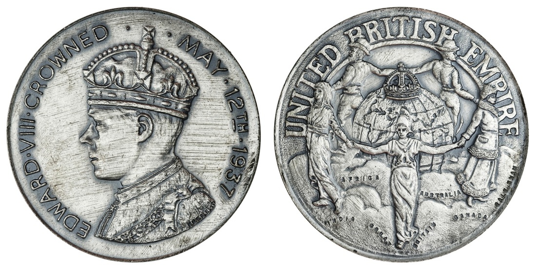 Great Britain. Edward VIII (1936). Intended Coronation Medal, 1937. Silvered Bronze, 49.7mm. Crowned bust left. rev. Five figures, hands linked, around crowned globe; UNITED BRITISH EMPIRE. Obverse streaks. Uncirculated.