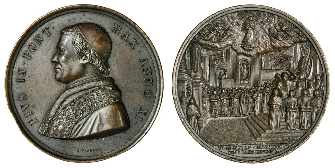 Papal/Vatican. Pius IX (1846-1878). Declaration of the Doctrine of the Immaculate Conception, 1854. Anno XI. Medal. Bronze, 43mm. Pontifex bust left, rev. the Pope standing before the Altar of the Throne in St. Peter's Basilica proclaiming to the assembled court the Doctrine; above, the Blessed Virgin attended by angels in the clouds, the radiant Holy Spirit at top - considered one of the most attractive Papal medal reverses. Bartoletti 856, Spink 2280. Very small edge bruise. Extremely Fine.