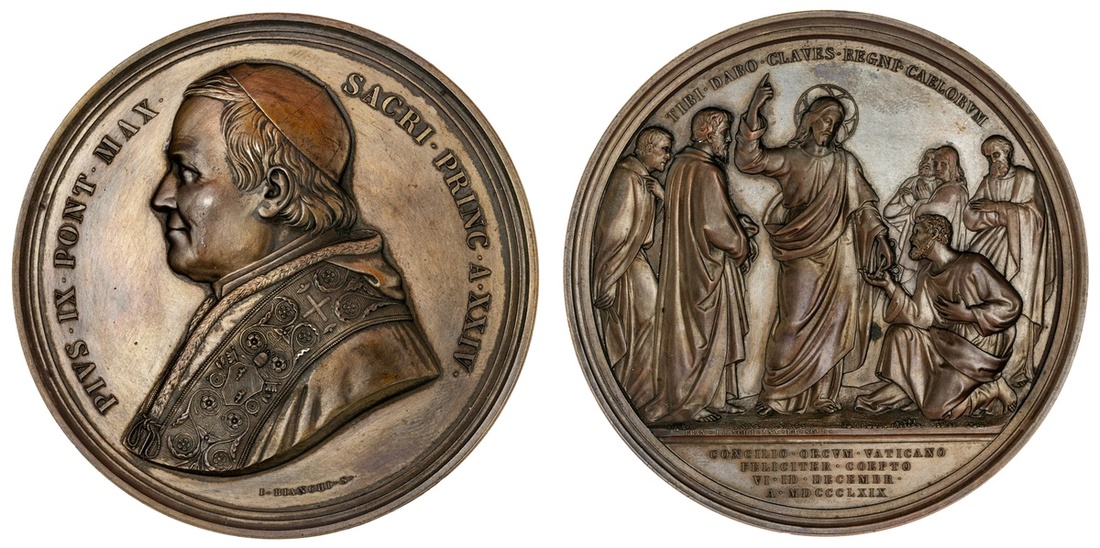 Papal/Vatican. Pius IX (1846-1878). First Vatican Ecumenical Council, 1869. Anno XXIV. Medal. Bronze, 74.5mm. By G. Bianchi. Pontifex bust left, rev. Christ giving the keys to heaven to St. Peter. Bart.XXIV-8. In original roundel. Once lightly wiped. EF-AU.