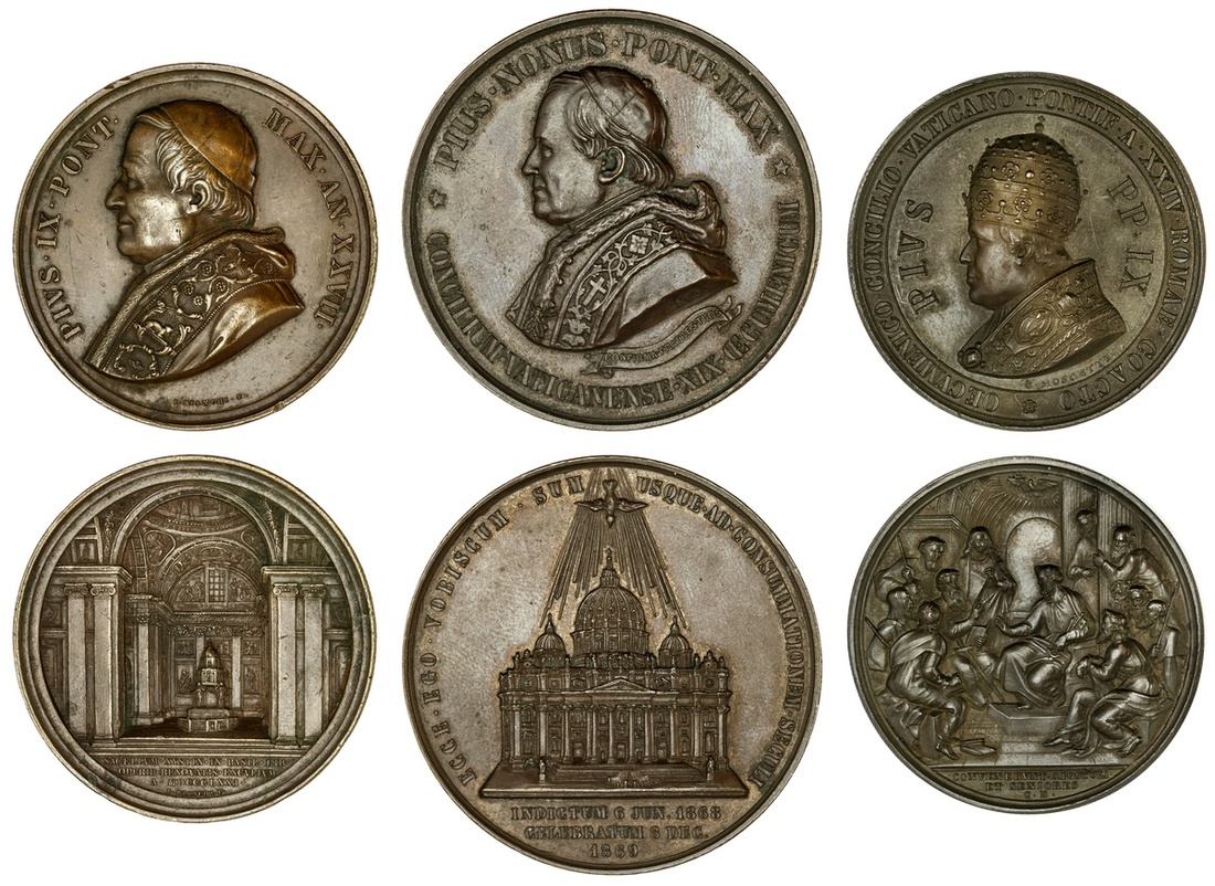 Papal/Vatican. Pius IX (1846-1878). Trio of AE Medals. First Vatican Council, 1869. 43mm. By C. Moscetti. Pontifex bust left wearing crown / St. Peter presiding over the first council; 19th Ecumenical Council, 1869. 50mm. By Voigt. Bust left / Radiant dove above edifice; and Restoration of the Sistine Chapel, 1871. 43.7mm. By Biachi. Bust left / View of the Sistine Chapel in S. Maria Maggiore Both Extremely Fine. (3)