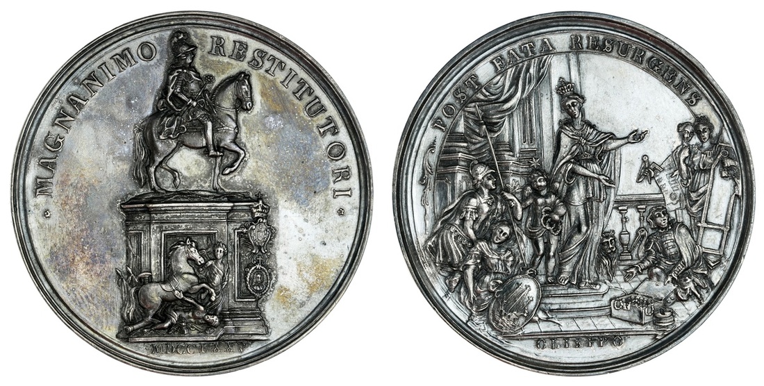 Portugal. José I (1750-1777). Reconstruction of Lisbon, 1775. Medal. Silver, 46.5mm. By José Gaspar. Equestrian statue of José I, rev. Crowned Lusitania standing before a portico urges Trade, Navigation, Architecture, and others to rise up after the Lisbon earthquake. Lamas 40, Würz 4150. Toned. Extremely Fine.