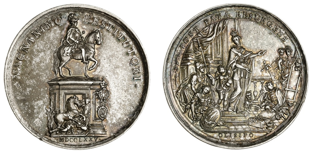 Portugal. José I (1750-1777). Reconstruction of Lisbon after the 1755 Earthquake and Fire, 1775. Medal. Silver, 46.7mm. 38.5 gms; By José Gaspar. City goddess standing amid Architecture, Trade, Ares and Science, rev. Equestrian statue of José I. Well.32. Small rim nick. Toned. About Extremely Fine.