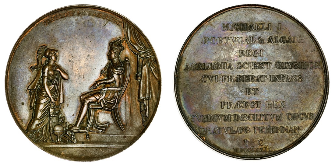 Portugal. Miguel I (1828-1834). 50th Anniversary of the Lisbon Academy of Science, Dedication to Dom Miguel I, 1829. Medal. Bronze, 57mm. Helmeted Lisbon holding decree and shield, globe, books and owl at her feet standing left before King Miguel seated right, rev. Nine-line legend, signed F.C. and Roman date below. Fernandes 101. Extremely Fine.