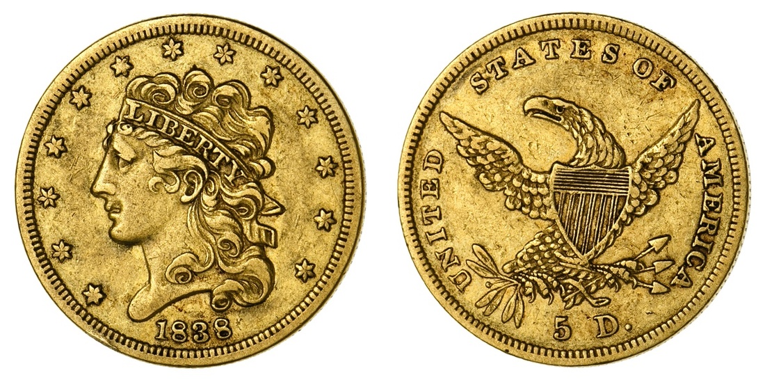 1838 Classic Head $5. Extremely Fine. Tiny rim tap.
