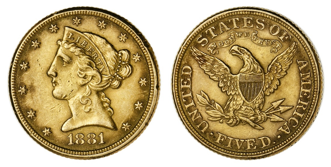 1881 Liberty Head $5. Extremely Fine. Some obverse nicks and digs.