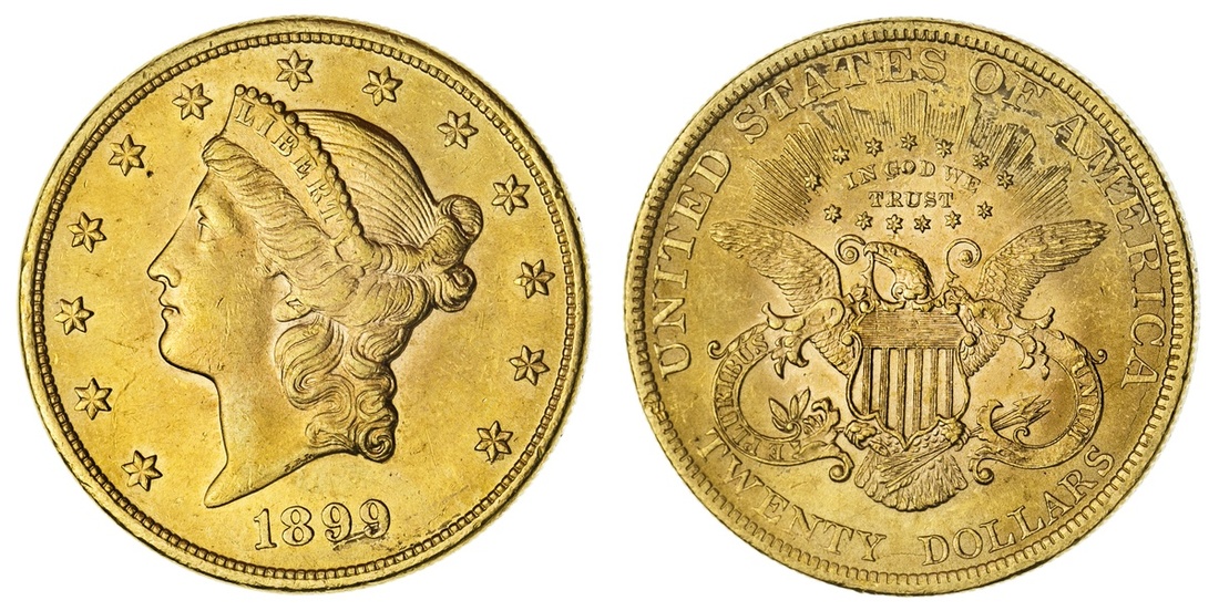 1899 Liberty Head $20. Uncirculated. Minor stacking marks. Lightly toned.