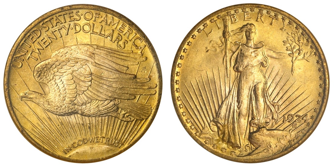 1924 $20 St. Gaudens. NGC MS 64. Lustrous wheaten gold.