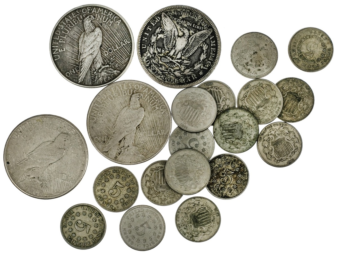 Lot of Shield Nickels and Silver Dollars. Shield Nickels(15): 1866 (2), 1867 No rays (3), 1868 (2), 1869 (4), 1870 (2), 1873 and 1874. Fine-EF; Silver Dollars (4): 1887-S, 1922-S, 1923-S, and 1924. Average circulated; also 1883 Liberty Nickel, with CENTS. Dirt spots. EF. (20)