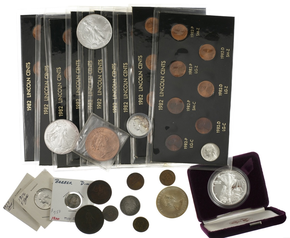 U.S. Odds 'n Ends. Includes: 1853 Liberty Seated Quarter, Arrows and Rays. VF; 1900 Barber Dime. VF; Proof Washington Quarters, 1954, 1956, 1957; 1943-S War Nickel. BU; 1909 Indian Head Cent. EF; Silver Eagles, Proof 1987 with case of issue; 2002, 2004 BU; 9 complete sets of 1982 Cent varieties (transition year from Copper to Copper-coated Zinc core Cents); Civil War Tokens (2) - Crossed flags/six-pointed star and Boutwell-Miller, Troy. EF and VF; Hard Time token and a Copper round; also: Canada. 5 Dollars-1 Oz, 1989; Habitat 2 Sous 1837 About Fine; Irish Unofficial Farthing 1834.