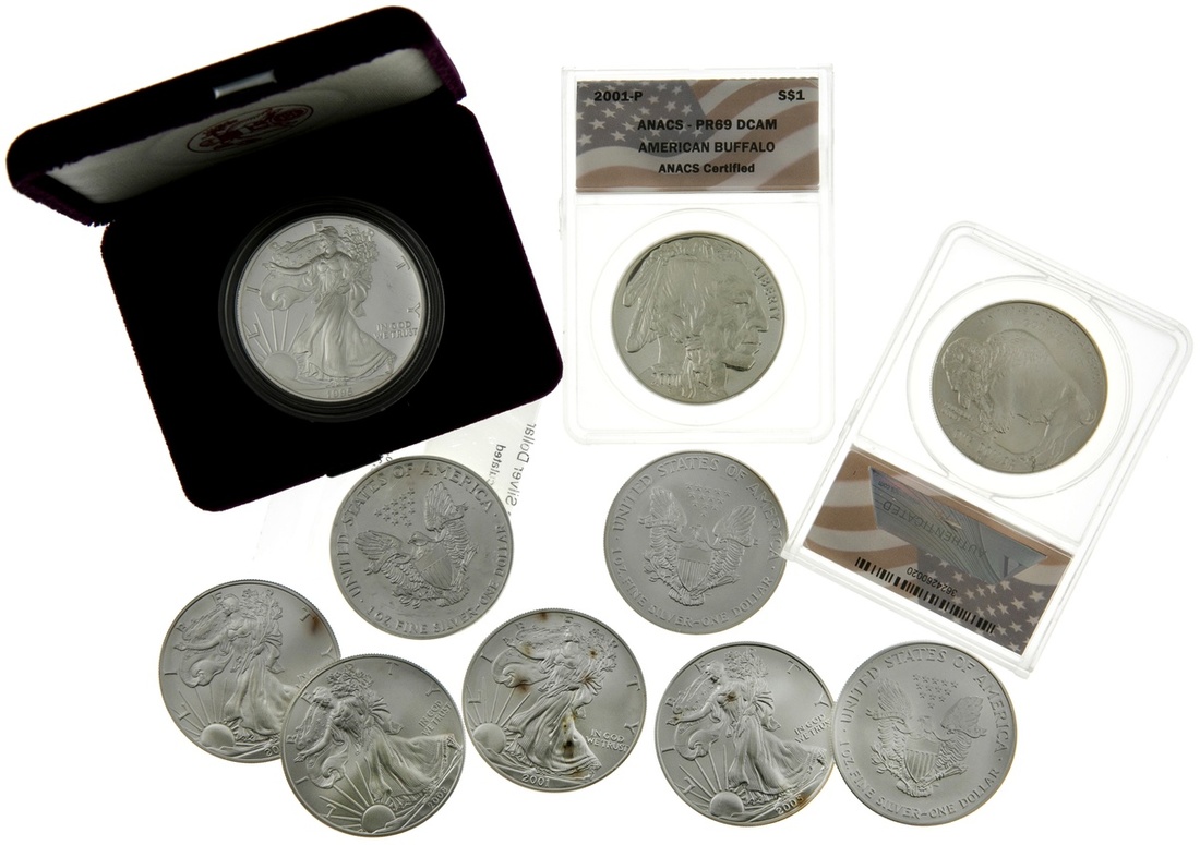 Lot of Silver Eagles. Includes: 1987, 2000, 2001, 2004, 2005, 2006, 2008. BU; Proof 1995-P. In original case. Gem Proof; also 2001-P and 2001-D Buffalo Silver Dollars. ANACS PR69 DCAM and MS 69.