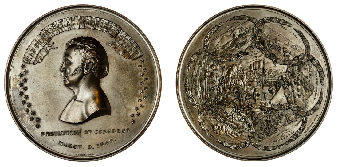 "1848" (struck after 1849) Major General Winfield Scott - Mexican American War Medal. Bronzed Copper, 90mm. By Charles Cushing Wright. Julian MI-26. Uncirculated. A few trivial contact marks. Deep coffee-brown.