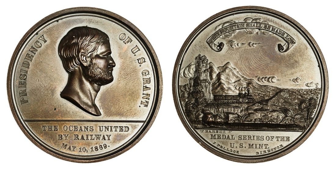 1869 Pacific Railway Completion Medal. Bronzed Copper, 45.4mm. By William Barber, Philadelphia Mint. HK-12, Julian CM-39. Rarity 5. Uncirculated. No signature on truncation suggests this is a restrike issue. Between 1869 and 1904 the mint produced less than 500 of these medals. A rare and very popular medal. Lustrous deep coffee-brown.