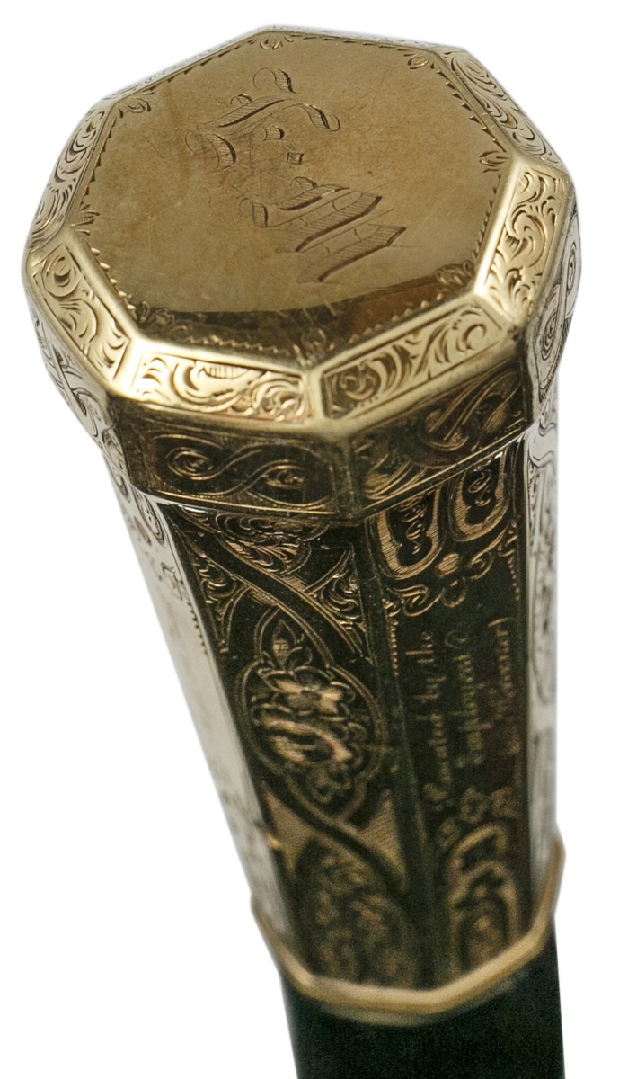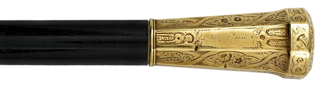 Mid-19th Century Gold-handled Walking Stick Presented to Edwin Moody, Anti-Slavery Abolitionist who was arrested and charged with assaulting the notorious slave catcher, bounty hunter, and Federal Deputy-Marshall Asa O. Butman during the Worcester anti-slave riots of 1854, and Agent for the Boston & Worcester Railroad Company.