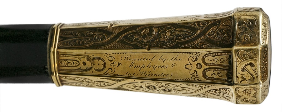 36" tapering ebonized stick; heavy, octagonal, faceted rose gold handle with sheath, 3"; with brass-mounted steel ferrule. The handle not hallmarked, but tested. Engraved in four panels of the handle sheath: "Presented by the Employees (at Worcester) of the Boston & Worcester Rail Road Co. to their late Agent Edwin Moody Esq July 4th 1857"; alternating with floral panels. The knob engraved with Moody's monogram: "E.M."