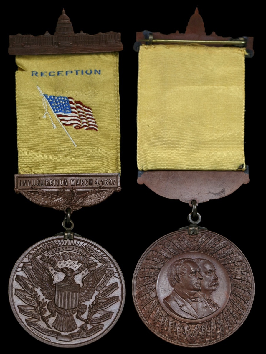 1897 McKinley Inauguration Medal - Reception Committee Badge. Conjoined busts of president-elect McKinley and his vice president Garrett Hobart right, around: 32 scrolls naming the states admitted to the Union after the first 13, rev. U.S. eagle ribbon around with the names of the 13 original states. On hanger and ribbon. Deep milk-chocolate brown. Uncirculated.