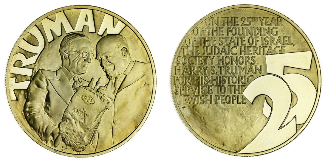 Judaica. Judaic Heritage Society - In Honor of Truman on the 25th Anniversary of Israel, 1973. Medal. Gold plated Sterling Silver, 39mm. 39.4 gms. By Oscar Harris and Harold Faulkner. Franklin mint. President Truman accepting the gift of a Torah from Dr. Weizmann, May 25, 1948, rev. Legend with large number 25. No. 5 on edge. Brilliant Proof.