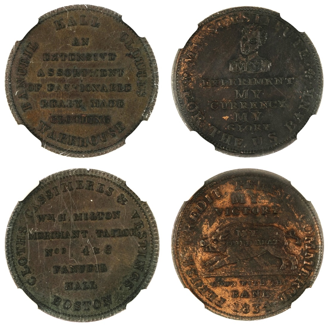 Hard Times Token Pair: 1834 Running Boar. HT-9. NGC Unc Details, improperly cleaned; and (1830-34) Boston. Wm. H. Milton. HT-163. NGC MS 62 BN. (2)